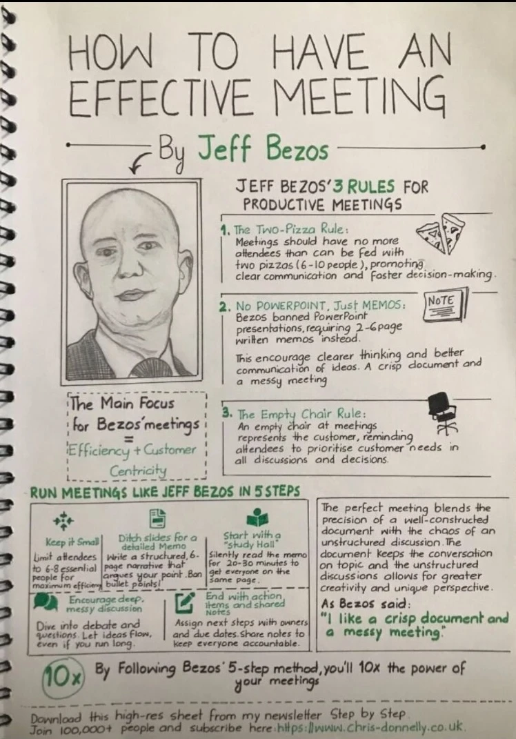 Die Güte der Meetings hängt von der Meeting-Kultur im Unternehmen ab. Diese lässt sich auf einen Schlag nicht ändern, jedoch schrittweise verbessern, indem Einzelne – in diesem Fall also du – die gewünschte Kultur als Vorbilder leben. Einen guten Leitfaden habe ich im Ansatz des Amazon-Gründers Jeff Bezos gefunden.