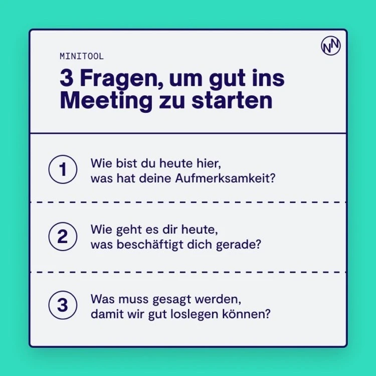 Diese Fragen können dem gegenseitigen Kennenlernen dienen oder durch Humor die Runde auflockern. Ich möchte hier drei Fragen vorstellen, die einen anderen Ansatz verfolgen: Hier geht es darum anzuerkennen, dass die Teilnehmenden gerade in Gedanken woanders sind und wir uns aufrichtig dafür interessieren. Wir erzeugen Verständnis füreinander und können uns danach auf das eigentliche Thema einlassen.