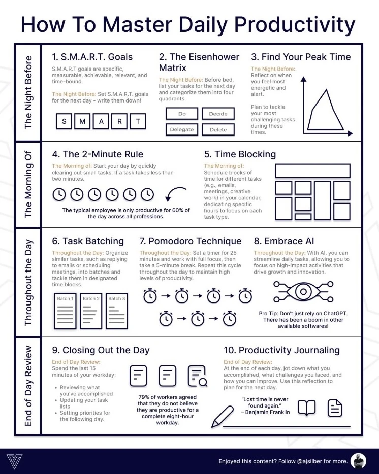 Die folgende Grafik gliedert die Techniken dahingehend ein, wann sie idealerweise am Tag angewandt werden, um maximal strukturiert zu arbeiten. An dieser Stelle möchte ich betonen, dass diese beschränkte Form der Optimierung zum Produktivitätshamsterrad führt. Der regelmäßige Helikopterblick auf das große Ganze darf nicht fehlen.
