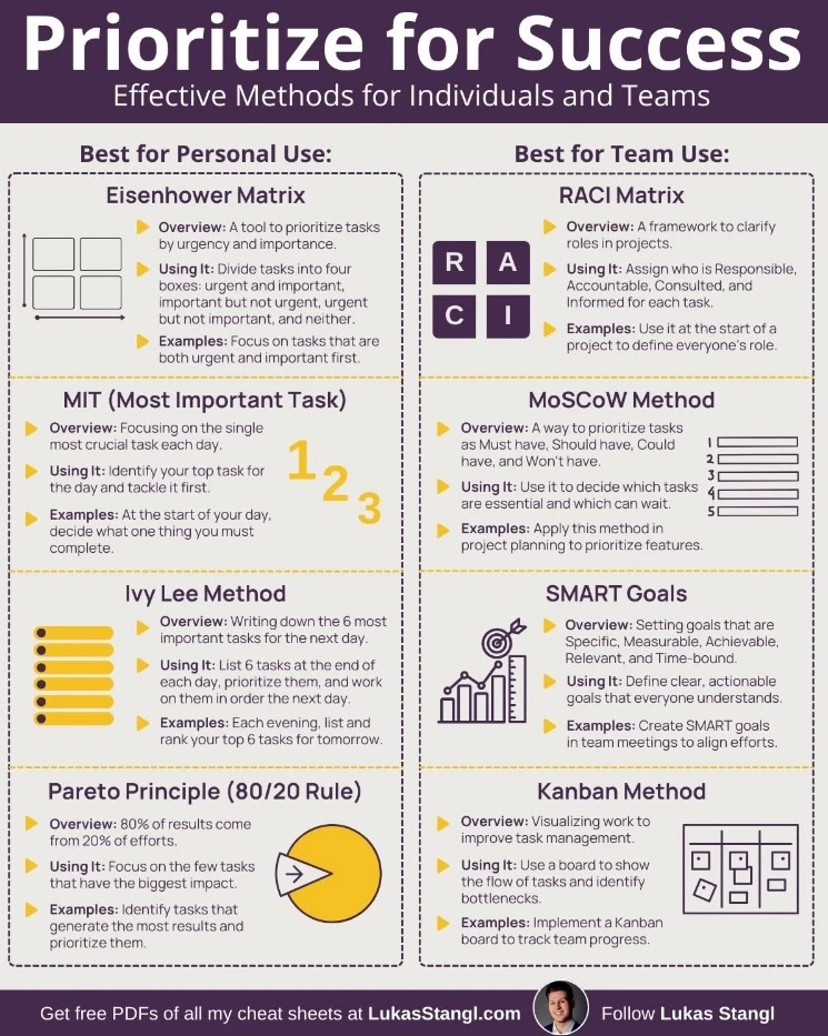 Wenn ich keine klare Priorität habe, verpufft mein Einsatz und ich komme zum gleichen Effekt, wie im dritten Teil skizziert: Ich war den ganzen Tag beschäftigt und ich habe (gefühlt) nichts geschafft. Damit genau dies nicht geschieht, entwickle ich klare Prioritäten. Dafür gibt es für das persönliche Umfeld und für Teams unterschiedliche Methodiken, die nachfolgend skizziert sind.