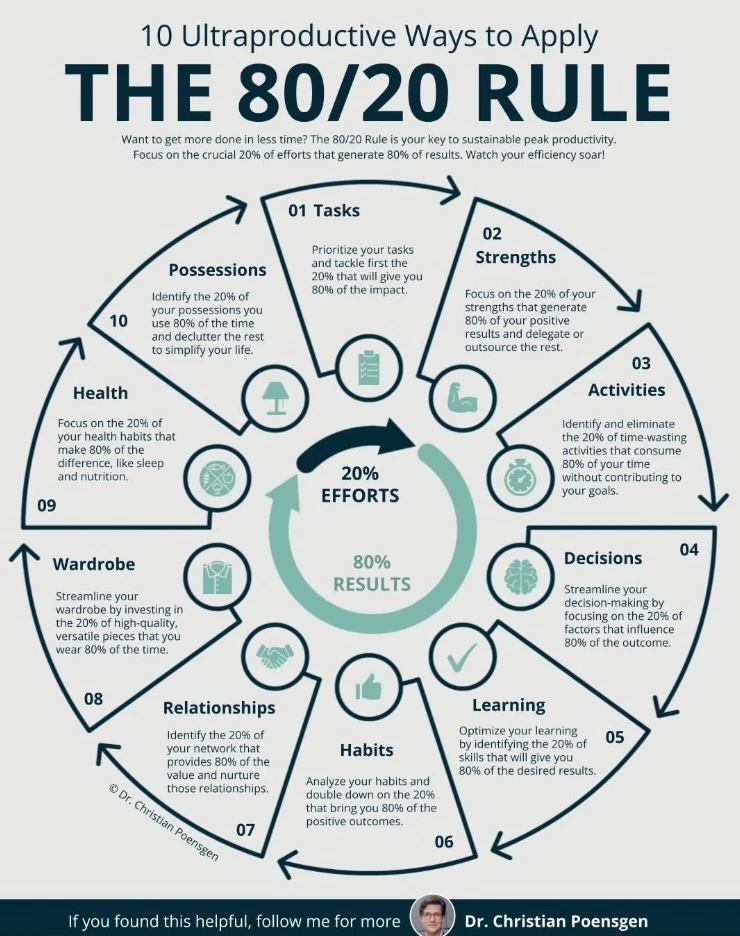 Zum Abschluss möchte ich dir das Sheet mit der Kombination der 80:20-Regel und den Tiny Habits zum "Entstressen" an die Hand geben. In diesem Kreislauf zeigt Poensgen, wie die 80:20-Regel auf unterschiedliche Aspekte des Lebens angewandt werden kann. Für mich liegt der Kern der 80:20-Regel darin, dass Perfektion kein Ziel ist, sondern eine Ablenkung bzw. Verschwendung.
