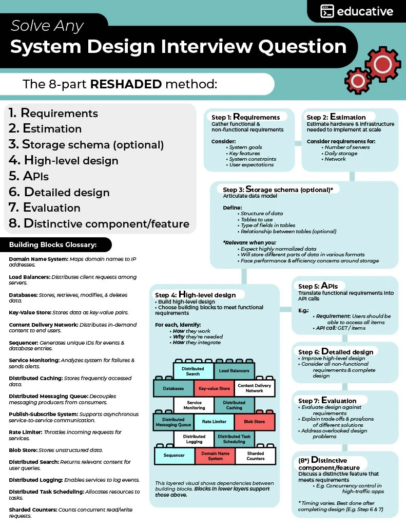 The following graphic illustrates this point. Educative's "RESHADED" method shows, on the one hand, the procedural steps for analyzing a system architecture and, on the other hand, the well-defined components (building blocks) that must always be aligned with the architecture's requirements.