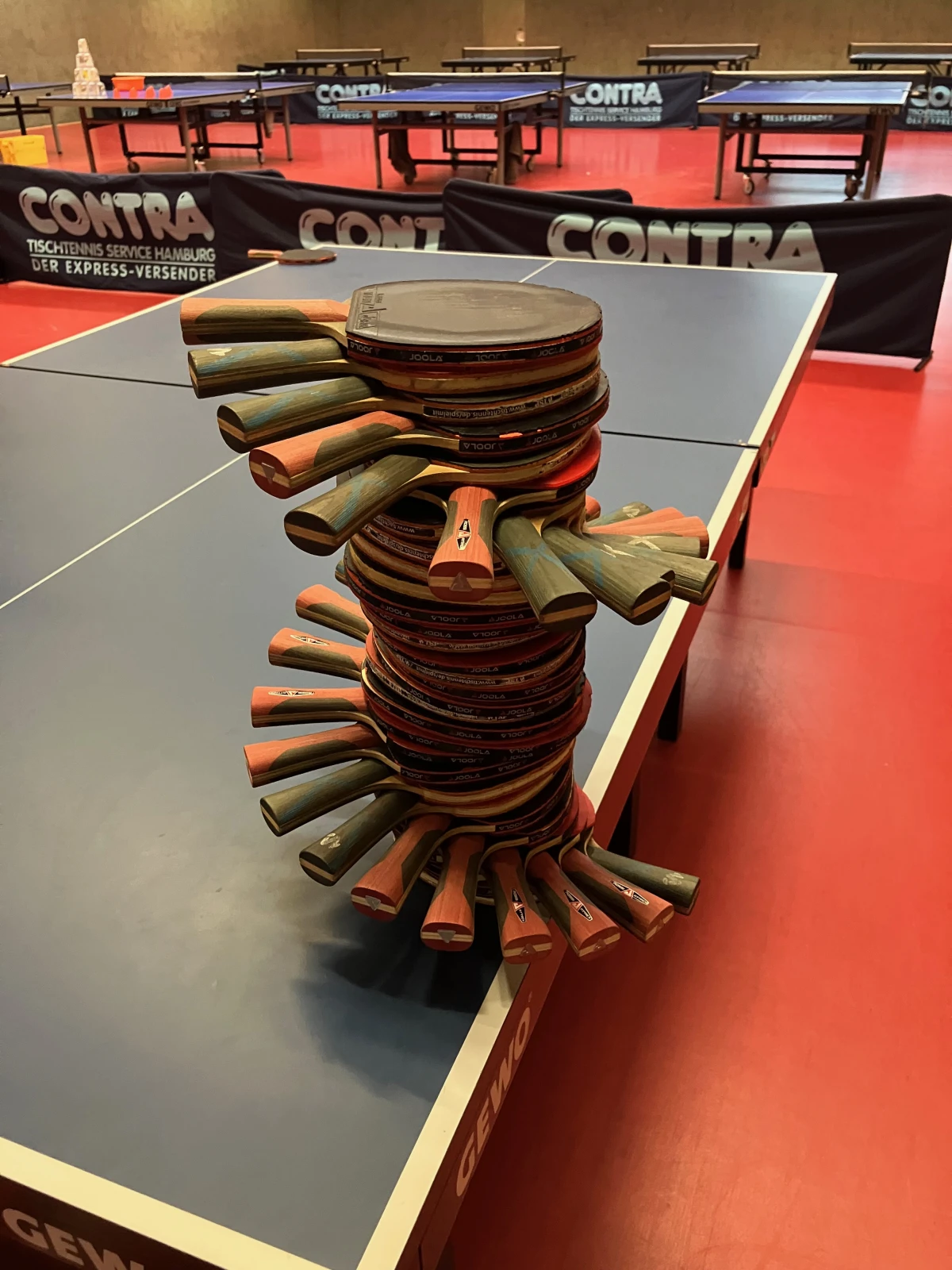 The table tennis racket spiral staircase for quick distribution to the participants. In the background, you can see the tables with small exercises for shooting objects. That was a highlight.